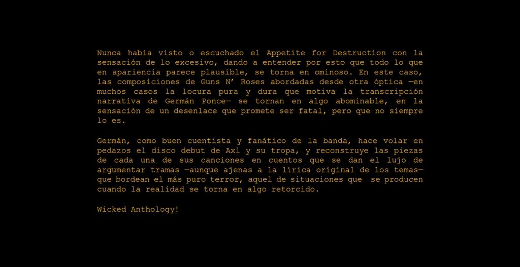 A través de 12 “readtracks” llenos de destrucción, humor y dramatismo, el libro rinde homenaje a cada canción del legendario disco Appetite For Destruction de Guns N’ Roses. Cada cuento es una alegoría de las historias sórdidas, intensas y auténticas que definieron una era.